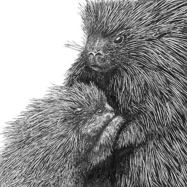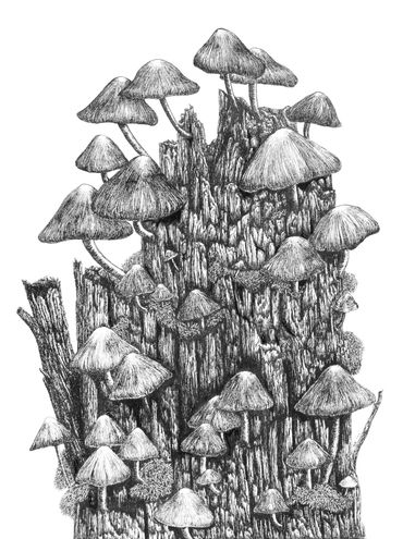 Kirsten Shelton illustrates the natural world through a detailed lens, finding interest in the textures, and seemingly infinite subtleties, that surround her in Southeast Alaska's temperate rainforest. Through pen and ink, Kirsten details the flora under our feet, the matrix of moss and tree limbs above our heads, animal docents (porcupines, otters, bears, bees, and others) who see us (and we sometimes glimpse as well), and other subtleties in the local landscape.